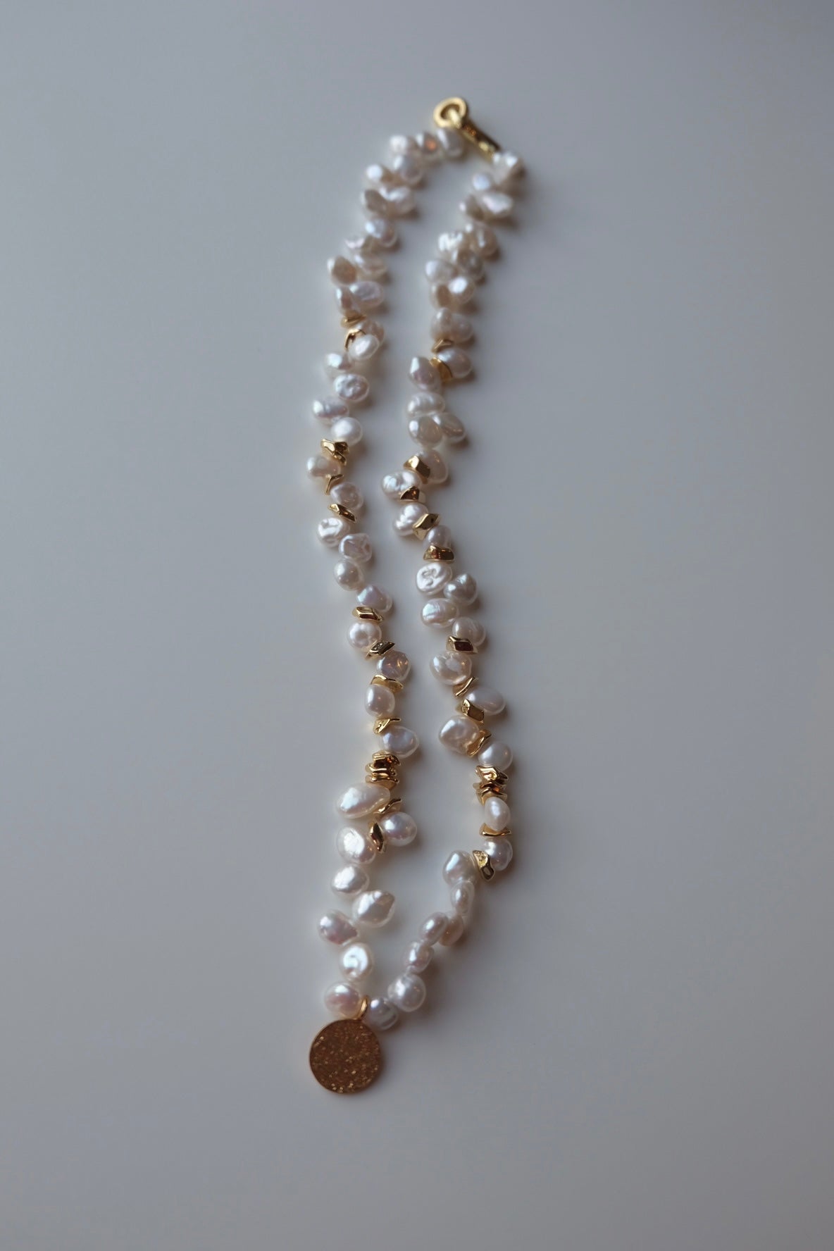 A strand of baroque pearls, each one wild and unique, anchored by a single gold vermeil disc.